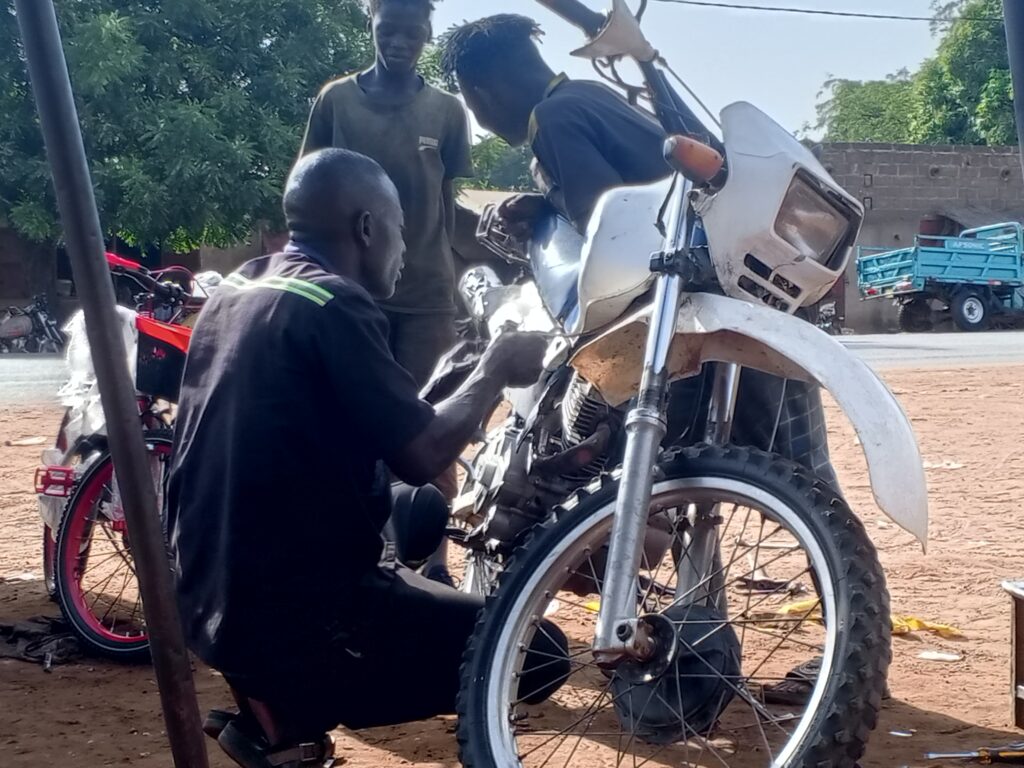Récemment, j’ai reçu une moto routière tombée en panne pour un problème de pneu. J’ai cherché toutes les solutions mais à cause d’un problème de clés non adaptées, je n’ai pas pu démonter la roue afin de dépanner le client. Je ne possédais pas ce genre de clés et j’ai tâtonné en vain. Par fini, nous avons embarqué la moto sur un tricycle pour Banfora au garage de Lass tenu actuellement par un de ses apprentis. Là-bas, ils ont pu trouver les clés nécessaires pour démonter la roue et gérer la situation. Lass avait su s’équiper en outils de travail.