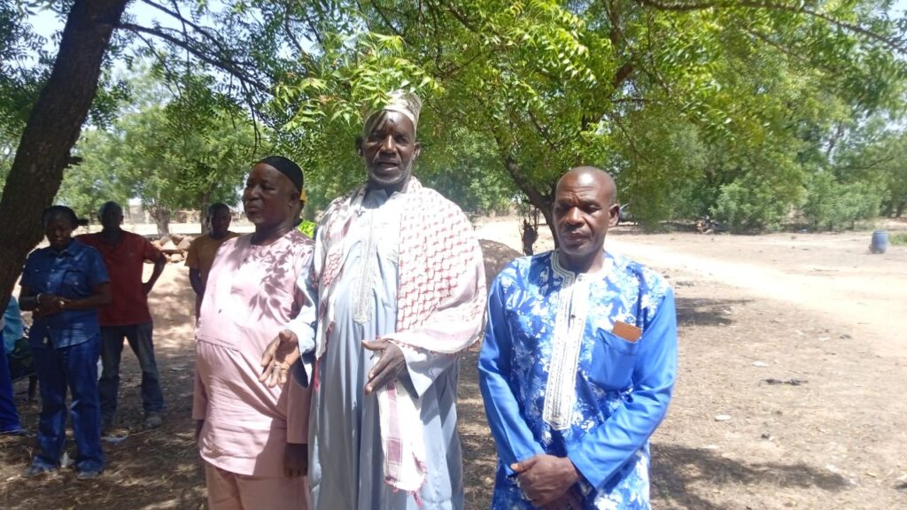 Le Directeur Exécutif de l’AGEREF-CL Mamadou Karama, le chef de village et les notables posant la première pierre