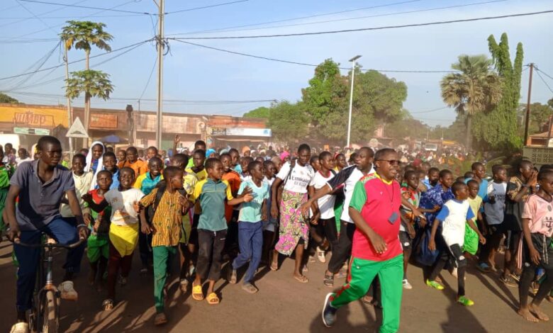 C’est peu après 16h que le top départ du cross populaire a été donné par le Directeur régional en charge de l’enseignement de secondaire, Alidou Karim Koné qui était en compagnie du Directeur provincial, Raphaël Soma et des responsables de la direction en charge des sports. Après avoir donné le top départ, Alidou Koné s’est placé à la tète du cortège des élèves, sportifs d’une soirée dont certains n’ont pas voulu se séparer de leur monture. A vélos ou à motos sans non difficultés, le cortège de ces milliers d’élèves s’ébranle dans les rues de la cité du paysan noir où il a regagné le rond-point du paysan noir. Passés à coté du camp CRS, les sportifs ont ensuite bifurqué à leur gauche peu avant la gare de compagnie de Transport Rakiéta, sont passés devant l’ancienne mairie avant d’emprunter la RN7 au niveau de la pharmacie Nadon avant de s’engouffrer dans l’enceinte du Lycée Municipal Héma Fadouga Gnambia. C’est au sein de ce grand lycée que s’est déroulée la séance d’aérobic où, sous la supervision des techniciens de la direction en charge des sports, les élèves ont effectué des étirements au grand bénéfice de leur santé et bien-être.